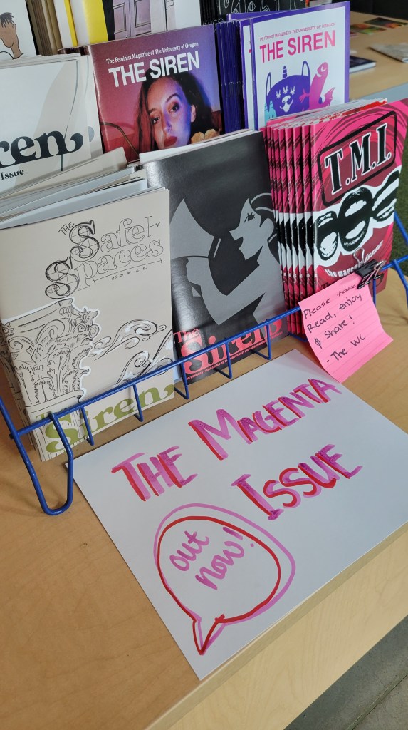 “it must’ve been only a year or two ago that ami got me really thinking about them—last summer, she showed me her collection, and it was also last June when I took every physical copy of The Siren I could find during my visit to UO! flash forward into fall term, and I’m the assistant editor-in-chief for The Siren as a new addition to The Feminist Hive. since then, zines have been a part of my everyday life, and I’ve loved collecting them from the College of Design and all around campus—I think it’s one of the things I miss most about the school year being over.”