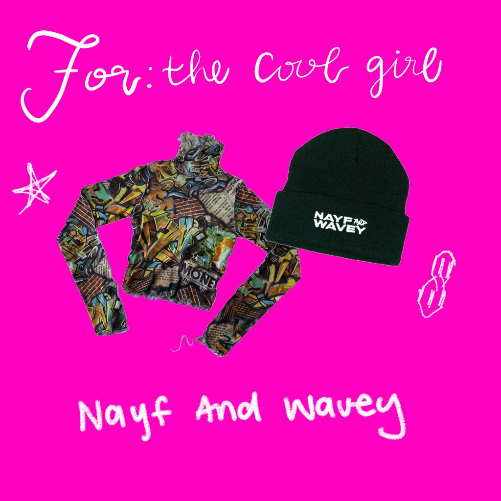 Nayf AND Wavey is a woman-owned and woman-operated skate/streetwear fashion brand. All of their pieces are handmade in Brooklyn and unisex. All of Nayf AND Waveys pieces are the perfect combination of trendy and unique and are sure to impress your coolest friends.