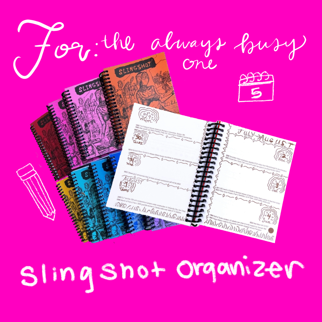The Slingshot Collective is a radical newspaper based in the Bay Area. Aside from being super cute and convenient for planning, their organizers have a ton of extra cool resources like book lists, period trackers, abortion access resources, tips on dealing with cops, and more. The organizers come in three sizes and tons of fun colors. Slingshot also has this super sick list of local bookstores you can support by purchasing the planner in-store!