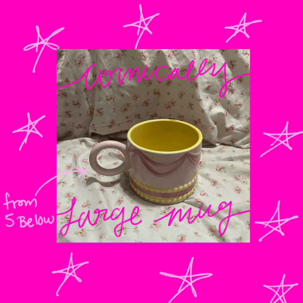 This story starts the same as any other, me aimlessly wandering the isles of 5 below after work. On my hunt, I spotted the holy grail, a giant cake-shaped mug. It wasn’t until I took my treasure home that I realized truly how massive it was in comparison to my other mugs. Drinking out of it makes me feel both dainty, and like Sofia Coppola’s Marie Antoinette. It’s bottom has enough surface area for it to sit comfortable on my bed without spilling, and it’s large enough to complete a proper bed rotting session without having to get up to refill. The only flaw of my beautiful, giant mug, is that I find myself with the desperate need to piss more than the average tea drinker.